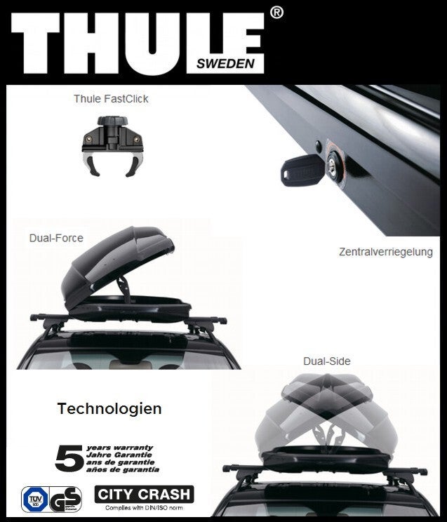 De dakkoffers van het type Touring van Thule bieden u een functionele dakkoffer voor al uw behoeften. De Thule Touring maakt gebruik van het FastClick montagesysteem. Met dit systeem bevestigt u eenvoudig en veilig de dakkoffer op de dakdragers. De klemmen van de FastClick zet u vast aan de draagstangen door aan de knop te draaien. Dankzij de DualSide opening kunt u vanaf beide zijkanten uw dakkoffer in- en uitruimen. De DualSide helpt u ook bij het bevestigen van de dakkoffer boven op uw dak, omdat u eenvoudig bij de 4 bevestigingspunten kunt. De Touring richt zich vooral ook op veiligheid, dankzij het centrale slot sluit u eenvoudig uw bagage af zodat u diefstal kunt voorkomen. Naast bescherming tegen diefstal is de dakkoffer ook veilig in gebruik en voldoet de Touring aan de City Crash norm.
